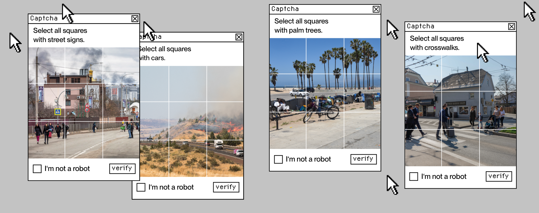 The different CAPTCHA images draw the viewer’s attention to problems in our world. In doing so, we verify that we are not robots, because unlike them, we have feelings and advocate for the future we want to live in.